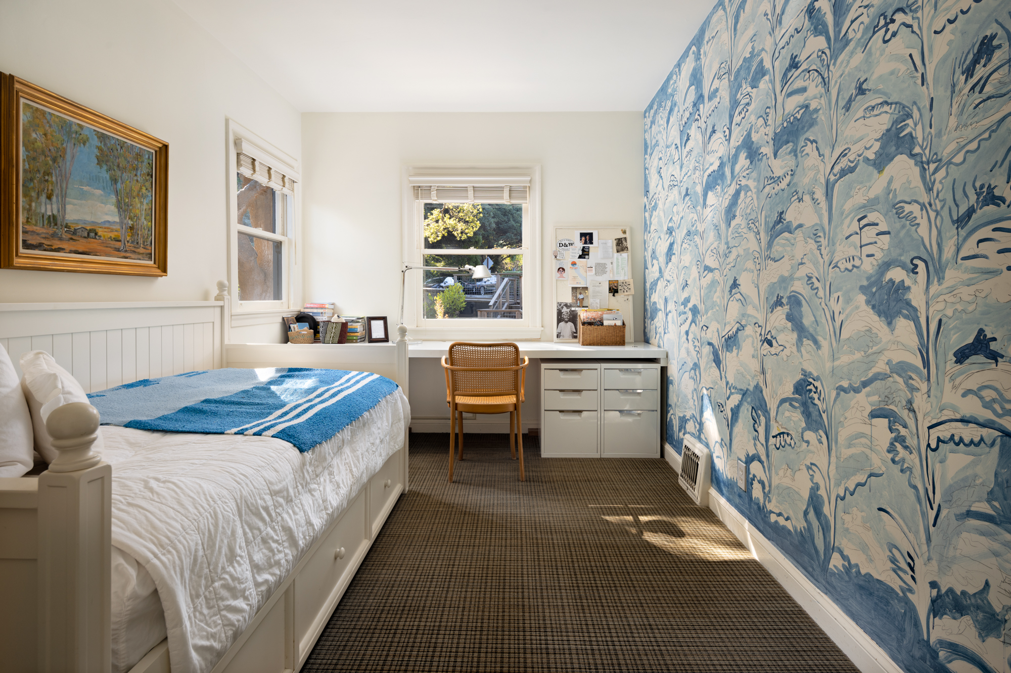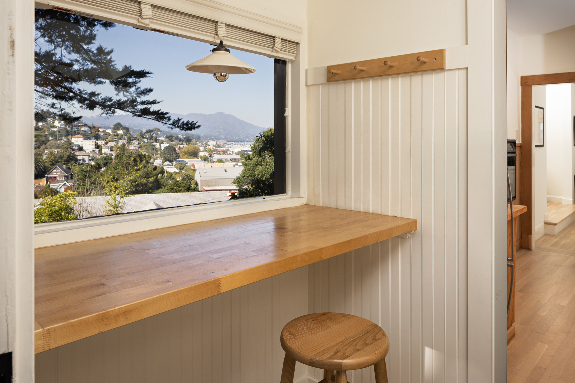 The main level features two bedrooms, a full bath, and inviting living, dining, and kitchen spaces ideal for entertaining or relaxed daily living. Upstairs, the primary and secondary bedrooms share a beautifully appointed bath, while the “crow’s nest” office provides a tranquil retreat framed by views of the Bay and Mount Tamalpais.