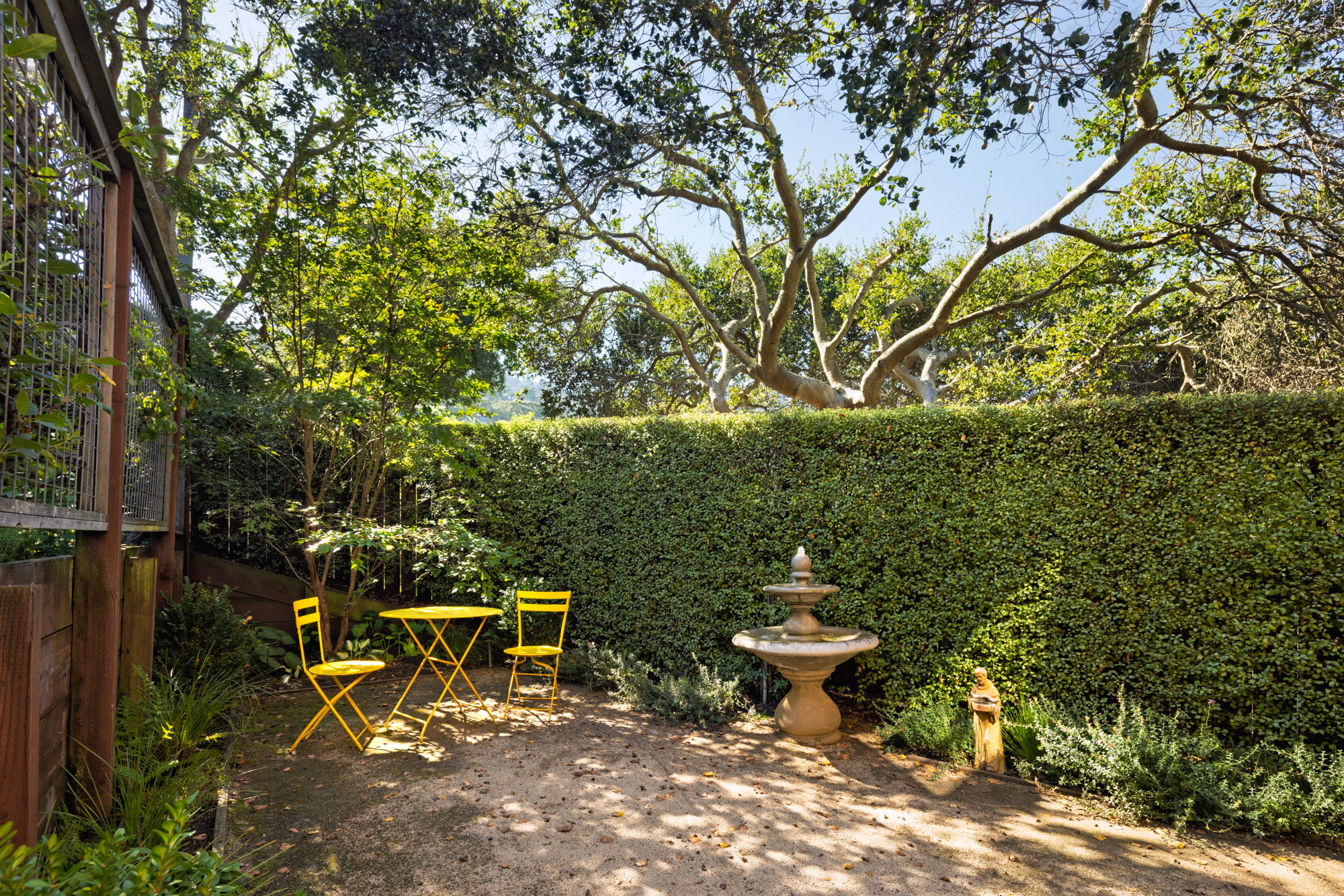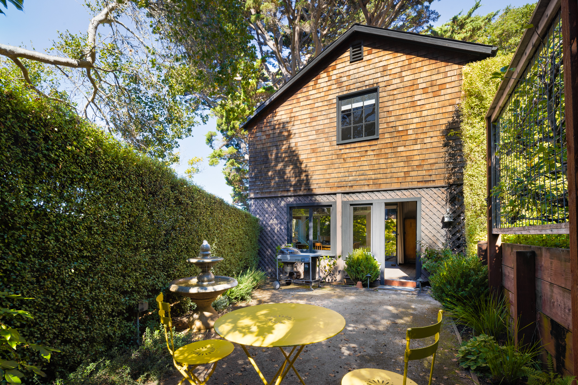Beyond the main residence, a brick pathway leads through an intimate council circle—a gathering place beneath the canopy of majestic Monterey cypress trees—to a separate garden Conservatory. This enchanting space serves as a versatile haven for art, dining, or gardening, opening to raised beds framed by mature landscaping.